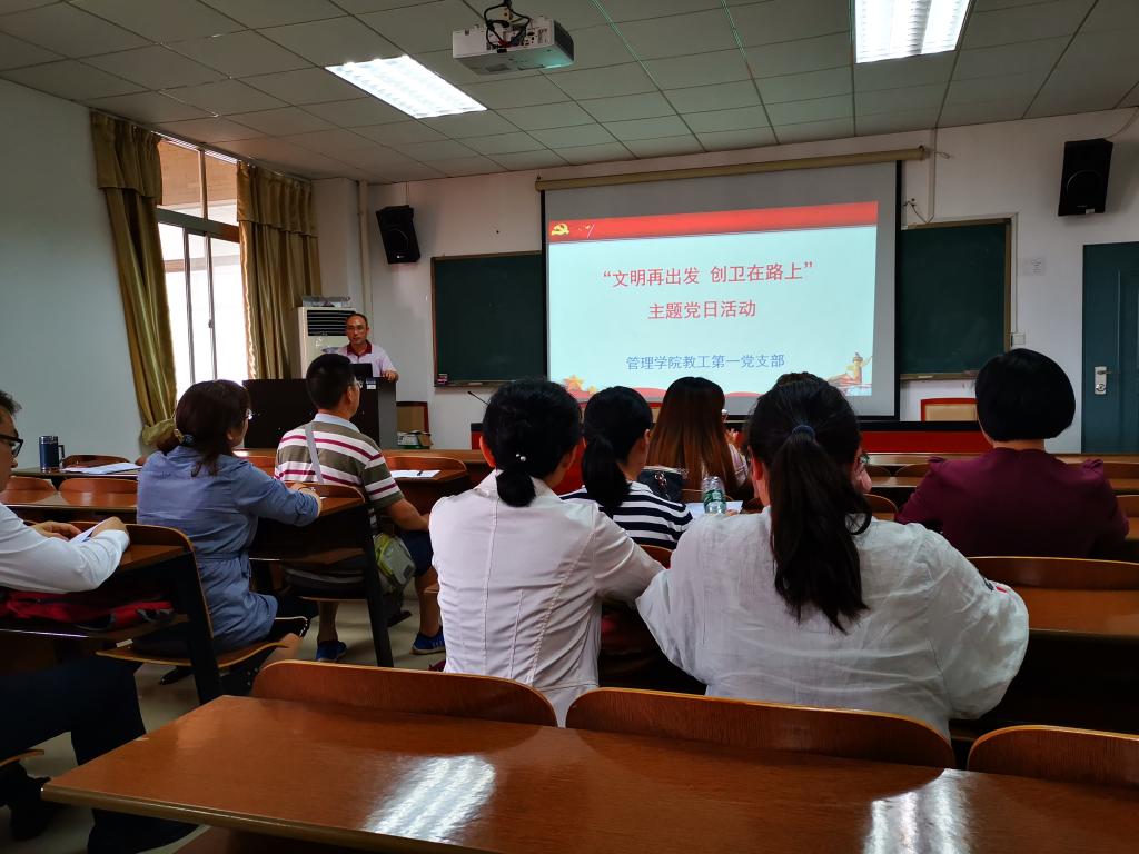 2019年5月28日下午,管理学院教工党员一支部进行了创卫宣讲党日活动。一支部书记黄毅带领党员同志学习了《湘潭市创建国家卫生城市工作方案》、《打好创卫攻坚战,党员争当急先锋倡议书》、《文明再出发,创卫在路上》。学习之后,党员同志们积极发言,争取为湘潭市创建国家卫生城市作贡献。