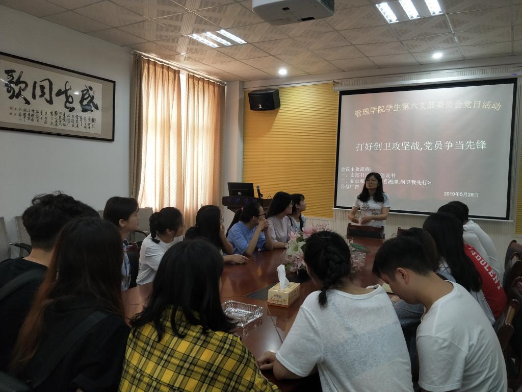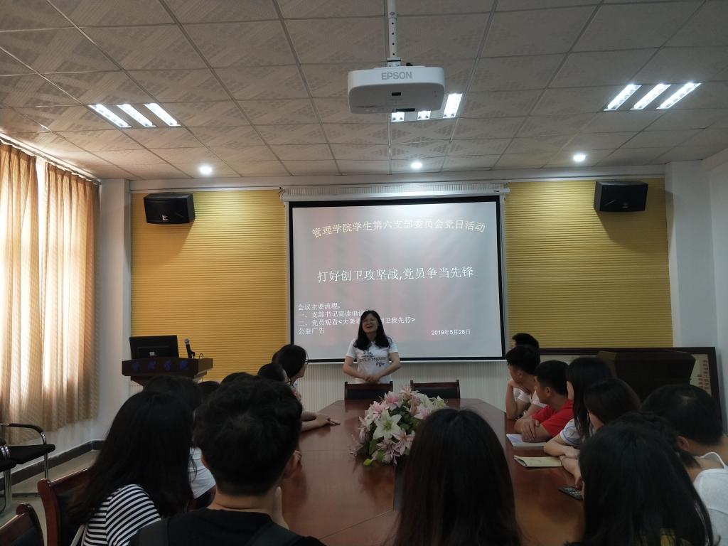 管理学院学生第六支部党日活动在F104顺利召开,活动的主要是关于创建卫生城市,打好创卫攻坚战,发挥好党员模范带头作用,支部书记周艺老师主持本次活动,全体党员参加。
