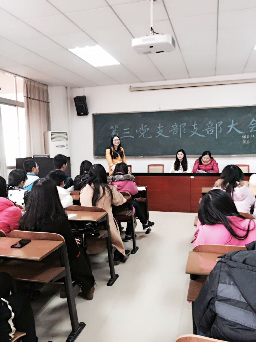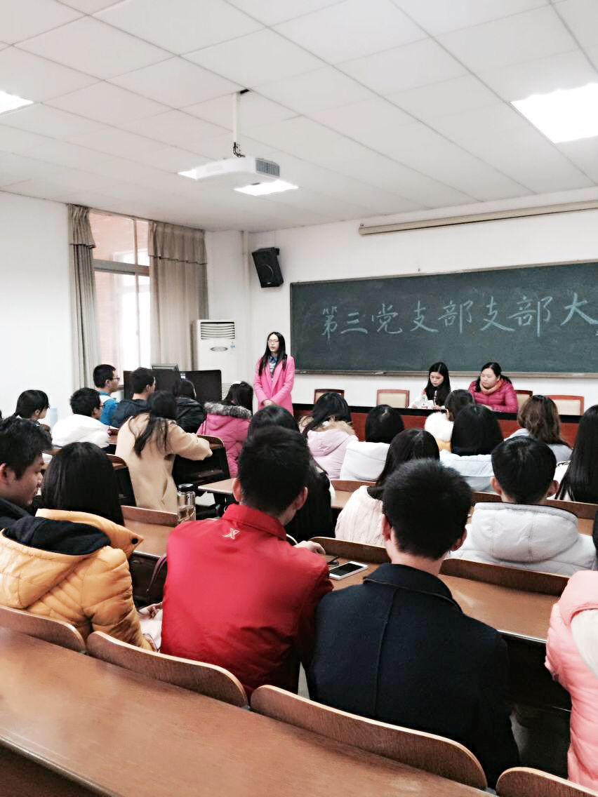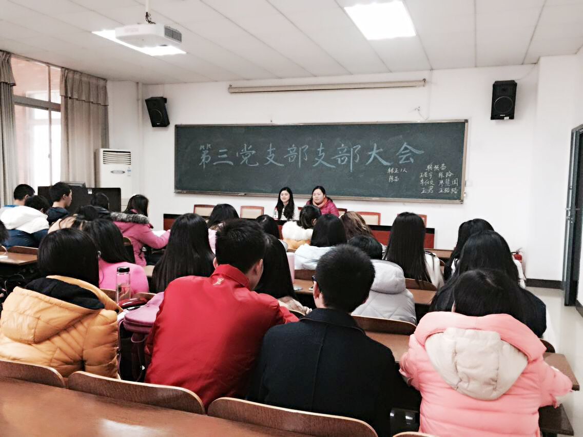 2015年12月8日中午12点30,管理学院学生第三党支部在G505召开了党支部大会,大会由管理学院学生第三党支部支委程烟兰主持,参加本次大会的有管理学院第三党支部书记:单艳艳,学生第三党支部支委:程烟兰,以及正式党员(6名)、预备党员(3名)、发展对象(6名)、培养对象积极分子若干名。