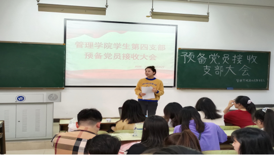管理学院学生第四支部于2022年5月20日在B106召开接收预备党员的支部大会。参会人员包括全体正式党员和预备党员,此次会议由支部书记陈景楠主持。