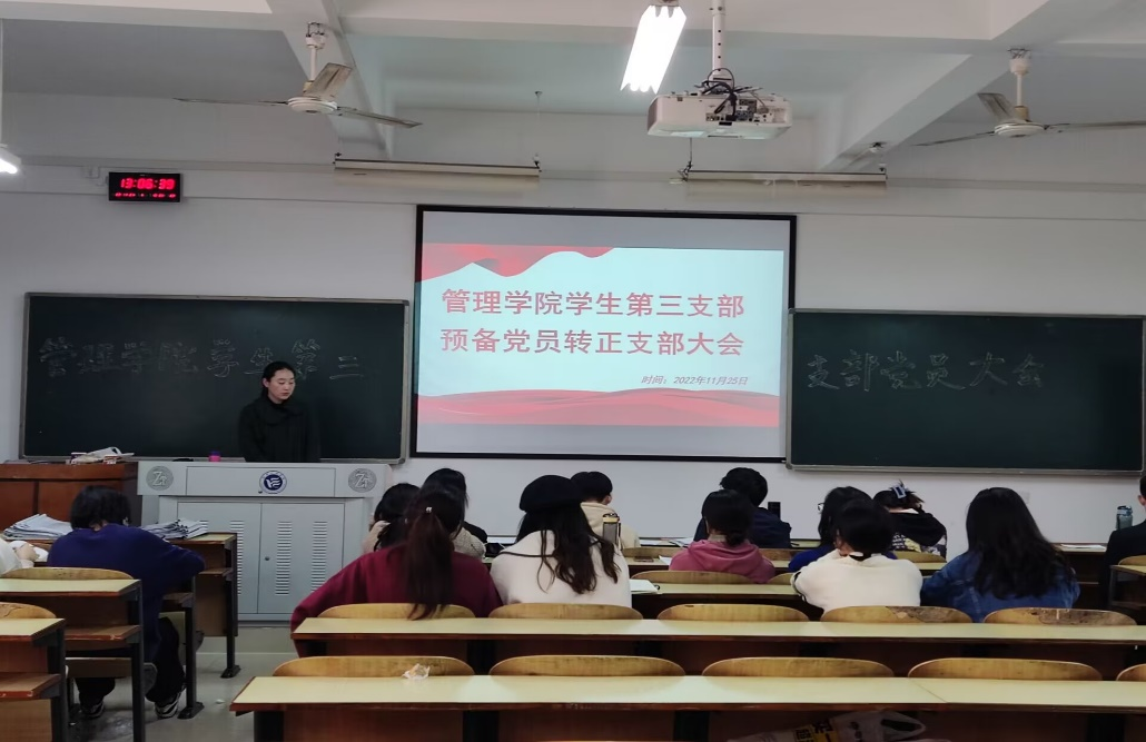 为进一步扩充党员队伍,增添新生力量。2022年11月25日中午12:30,管理学院学生第三支部委员会在新校区教学楼C栋202召开预备党员转正大会,讨论舒叶等7名预备党员的转正问题。会议由支部书记陈祎婷同志主持,支部共14名正式党员、22名预备党员参加会议。