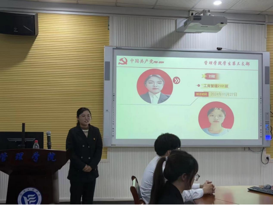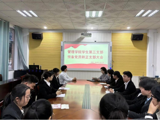 为进一步发展壮大支部党员队伍,团结支部党员。2024年11月27日,管理学院学生第三支部委员会在F104召开预备党员转正大会,讨论刘敏等5名预备党员的转正问题。会议由支部书记彭小玲主持,支部共有4名正式党员,13名预备党员参加会议。