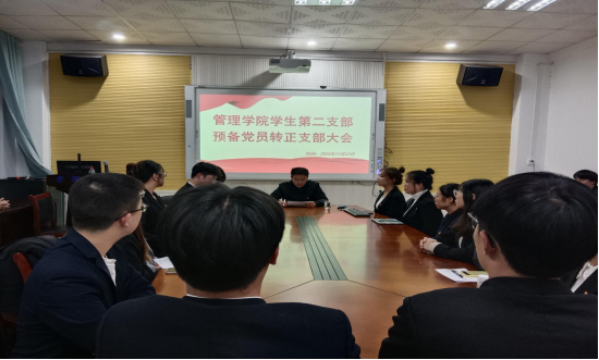 矢志不渝跟党走,砥砺奋进新时代。为进一步强化党员队伍建设,增添党组织的蓬勃生机与活力,11月27日,管理学院学生第二支部委员会在F104召开预备党员转正大会。此次会议由支部书记谭浩博主持,支部全体党员参与本次会议。