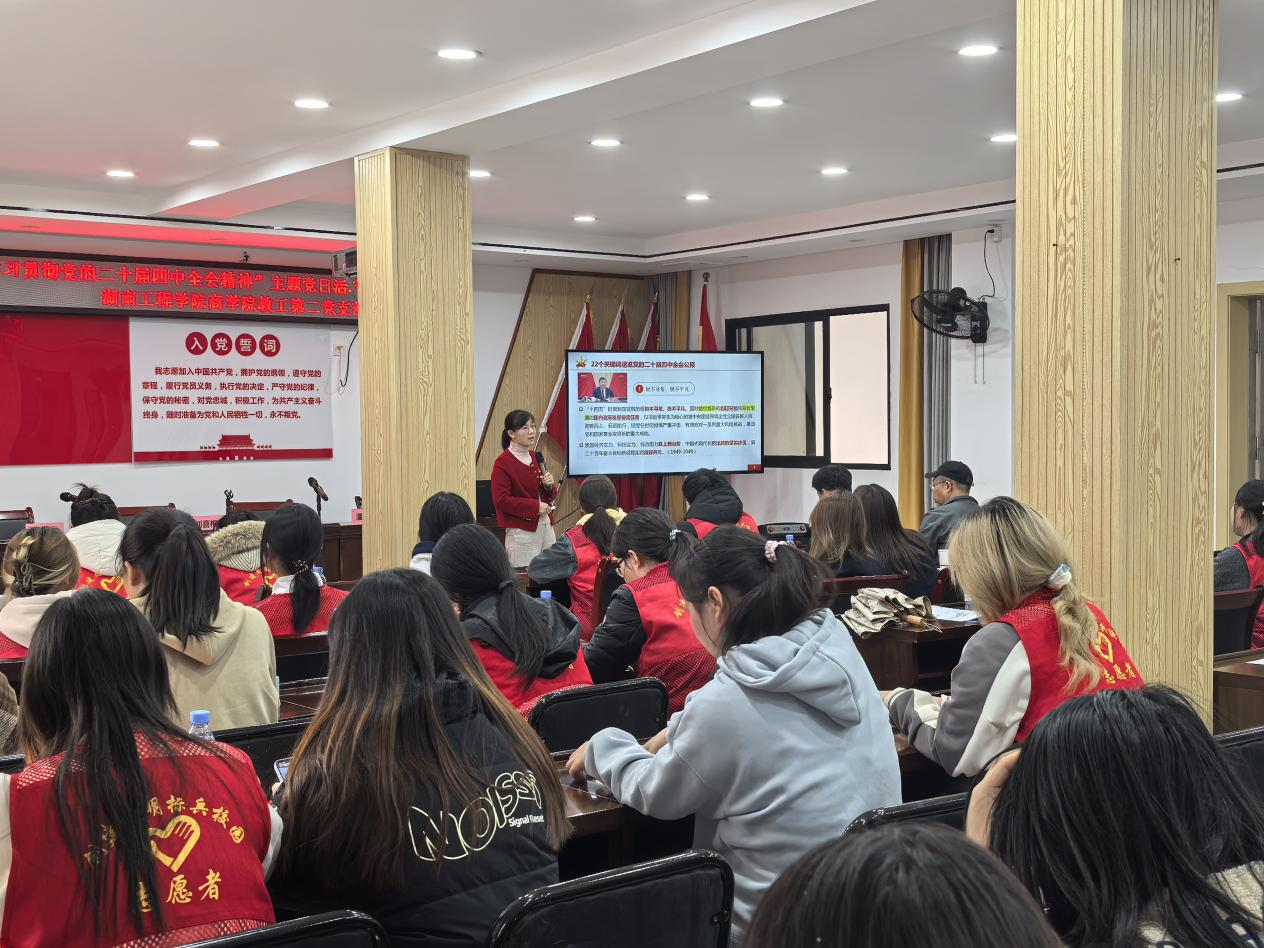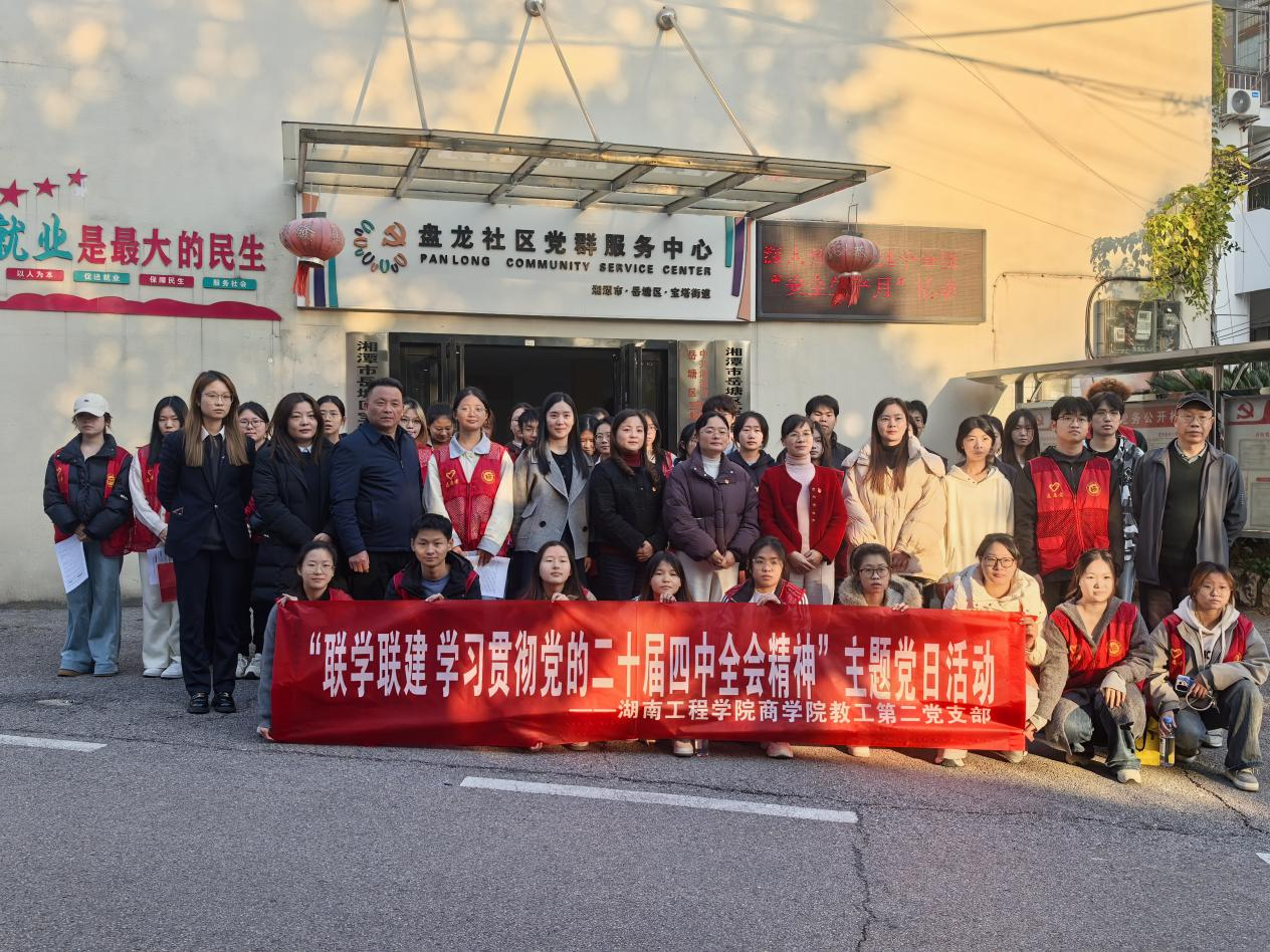 教工第二党支部在岳塘区宝塔街道盘龙社区党群服务中心举办“联学联建 学习贯彻党的二十届四中全会精神”主题党日活动。盘龙社区党员、居民代表及学生入党积极分子等40余人齐聚一堂,共同学习领会全会精神。