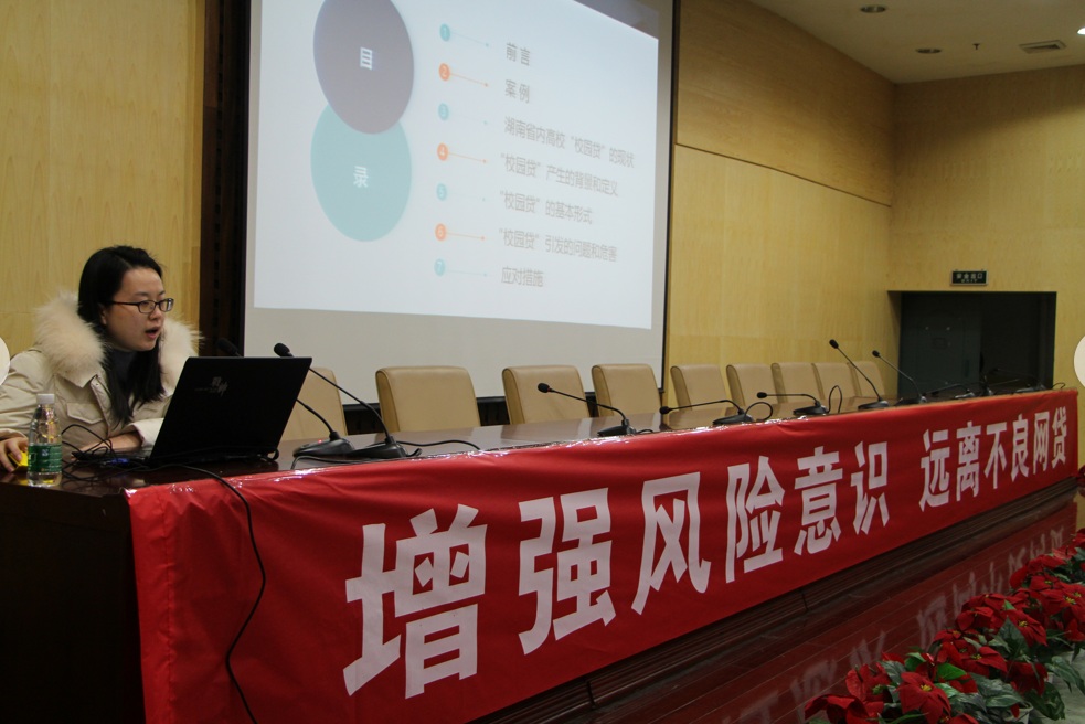陈璟轩就校园贷的现状和问题,从校园贷真实案例、湖南省内高校“校园贷”的现状、“校园贷”产生的背景和定义、高校校园贷的基本形式、校园贷所引发的问题和危害以及校园贷的应对措施等七个方面为我们展开了生动又不失严肃的讲解。陈老师以发生在我们身边的真实案例进行分析,使人感触尤其深刻,提醒着我们进一步树立正确的消费观,认识到生命的脆弱与可贵,时刻怀有对生命的敬畏之心。