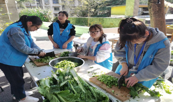 志愿者合作在切菜