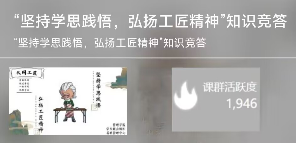 5月5日至7日,以易班APP为载体,搭建“青春不朽”主题平台,通过视频和文字相辅相成的形式介绍先辈们为革命付出的青春与热血,并以签名墙的形式呈现同学们的满腔热情。漫漫征途,学无止境。与此同时,学院还开展了“坚持学思践悟,弘扬工匠精神”线上知识竞答活动,后台数据显示,共有1946人参与作答,合格率为82%。管院广大学子以先学后答的谨慎态度为本次活动交上一份满意的答卷。