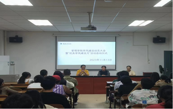 为更好地建设良好的院风、学风,培养德智体美劳全面发展的社会主义建设者和接班人。管理学院于11月13日下午在主校区F104召开学风建设动员大会暨“优良学风建设月”活动启动仪式。管理学院副院长张维梅、党委副书记谭超、辅导员李林老师出席,管理学院全体学习委员、学风建设小组全体人员参加。