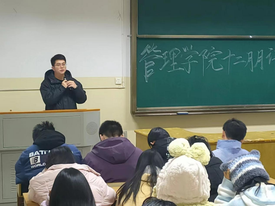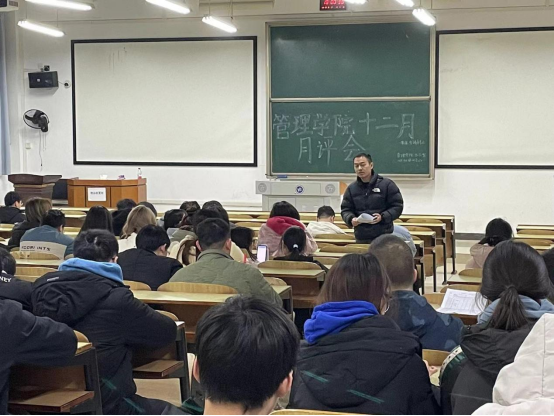 管理学院主校区大一全体同学,大二、大三各专业班级学号为双数的同学,大四各班五名班委,南校区全体同学参与了会议讲评。本次会议由八名学办老师进行线下月讲评。会议内容分为常规工作报告、学生活动、共青团工作、党务工作和安全教育五个部分。