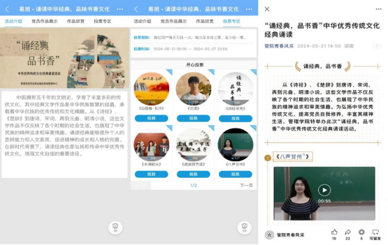 在学院易班管理中心和各班班委的积极发动下,各班同学积极响应,认真选择经典书籍进行朗诵视频拍摄。在收到的视频中,经典的篇章如美妙的乐章在空气中回荡,《论语》的智慧、《诗经》的风雅、唐诗宋词的韵味,一一展现在众人面前,同学们用自己的方式诠释着经典的魅力,让这些古老的文字焕发出新的活力。从收到的视频作品筛选出优秀作品放至易班平台进行展示、投票。还通过学院微信公众号“管院青春风采”进行宣传和推广,不仅收获了师生们的一致好评,同学们目睹文化盛宴,师生好评如潮。物流管理2101班王震宇同学在欣赏完相关作品后感慨道:“我很自豪有如此优秀的传统文化供我们学习,以后我要向先辈们看齐,将中国优秀传统文化发扬光大!”最后,为期六天的投票结束,易班管理中心将投票结果进行公示,分别评出最受欢迎奖1项,最具表现奖5项,本次活动圆满落幕。