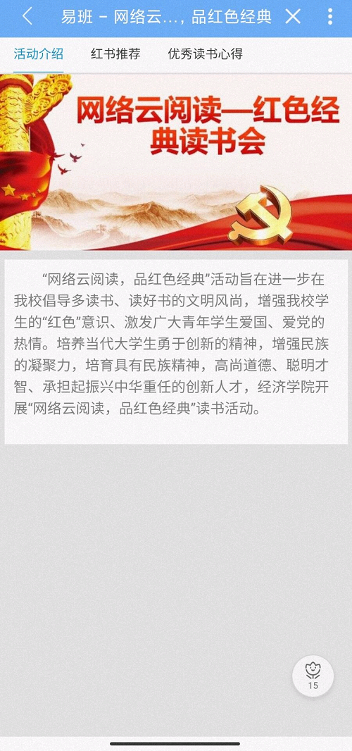 为提升广大学生的思想政治素养,用红色书籍引领思想航向,激励学生们树立正确的思想政治意识,传承红色基因、接力复兴伟业。经济学院于6月14日至6月17日在易班app开展网络云阅读——红色经典读书会活动。本次活动由经济学院学习部和组织部组织,经济学院全体学生参与了本次活动。