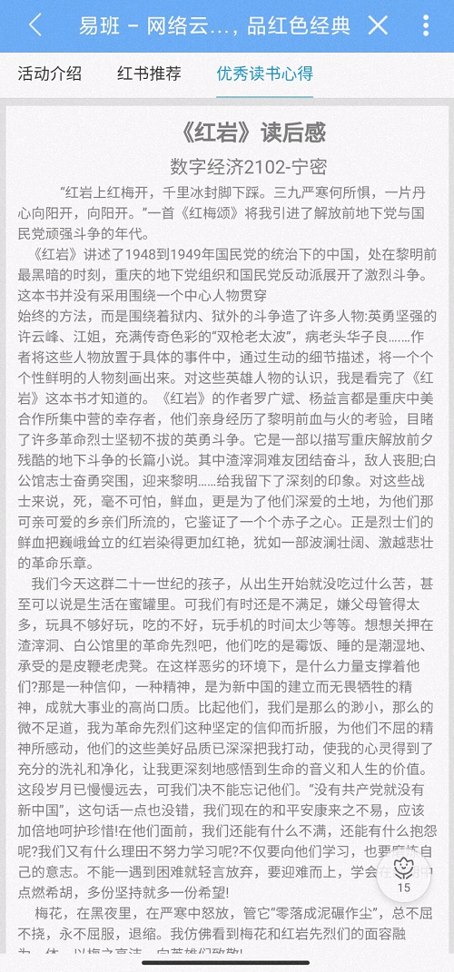 在本次活动中,各班班长与团支书做好前期准备工作,完成了各自班级的任务部署,同学们通过易班平台,以线上投票的形式推荐各自心目中的红色经典书籍,营造对红色文化的浓厚学习氛围。在班级读书会中,各班班长带领同学们阅读红色书籍的经典篇章,深刻领会其中的思想哲理,汲取爱国主义精神养料。随后,各班积极组织学生观看《朗读者--红岩篇》,以此来品味革命时期的红色精神内涵。最后,各班级利用易班平台交流阅读心得,分享阅读收获,并书写读后感,进一步增强学生的社会历史使命感和责任感。学习部择优推荐读后感至易班平台展示分享,激励同学们在红色书籍中寻找先辈的足迹,接受思想的洗礼。