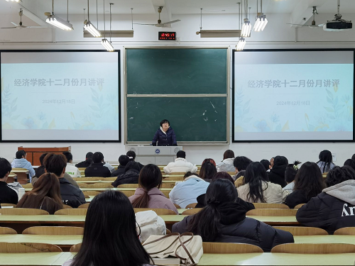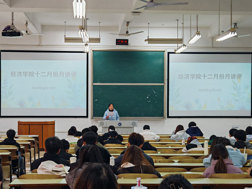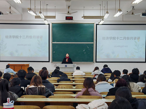 2024年12月18日中午12点40分,经济学院于主教学楼D101召开十二月份月讲评,学办主任戴晶晶,学生辅导员李军花、团总支书记刘佳馨出席本次大会,参加本次活动的还有大一至大四各班主要班干部以及团学会全体干部。