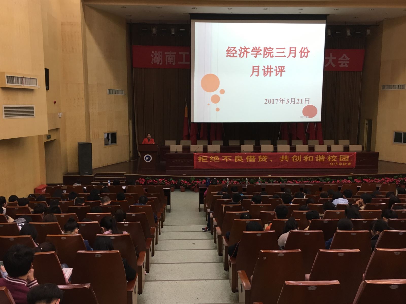 为进一步加强学院学风建设,推进学院工作顺利开展,3月21日中午1点,经济学院三月月讲评在图书馆一报告厅举行。本次会议由经济学院党总支副书记毛晓华、学办主任李军花主讲,经济学院大一、大二全体同学及大三各班班委共同参加。