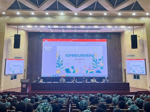 2024年9月24日晚上19:00,经济学院在图书馆一报告厅召开九月份月讲评,党委书记黎娅、副院长曾贵、党委副书记卢时光、学办主任戴晶晶、学生辅导员李军花及团总支书记刘佳馨出席活动,经济学院2024级全体新生及新生朋辈辅导员参加活动。