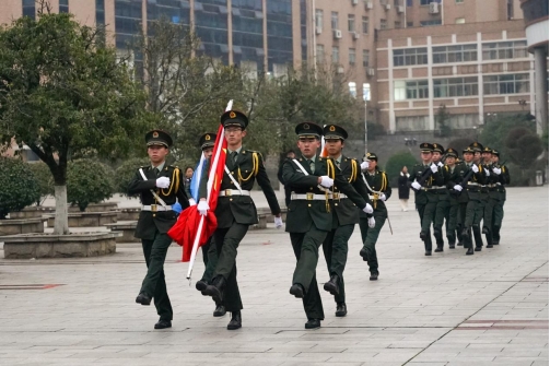 清晨七时整,国旗仪仗队迈着整齐划一、铿锵有力的步伐,护送五星红旗稳步走向旗杆。伴随着《义勇军进行曲》的激昂旋律,学院全体师生面向国旗肃立致礼,注视着五星红旗冉冉升起,在熠熠晨光中迎风飘扬。