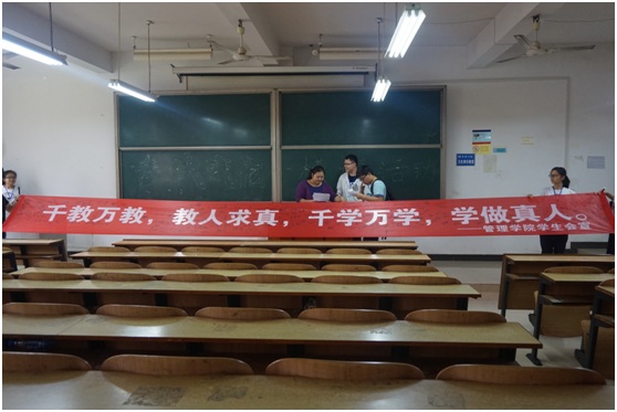 5月30日中午12点,管理学院辅导员老师与全体学生在教学楼D栋召开“文明考风·诚信考试”签名活动,旨在响应学校关于教育大学生“助学筑梦,诚信成才”的思想,提高人才培养质量和大学生诚信道德意识。