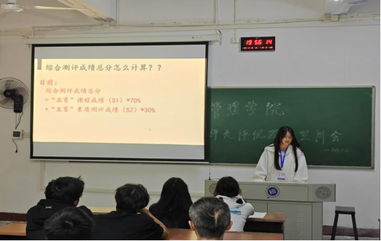 活动开始,资助中心部门干事们结合精美细致的PPT从奖学金的种类入手,包括校内综合奖学金、专项奖学金等向同学们 详细解读了校奖学金及评先评优政策的各项内容,同时介绍了每种奖学金的设立目的、评定标准以及奖励金额。在校内综合奖学金方面,向同学们强调了学习成绩、“五育综合素质测评”分数以及专业排名等关键因素在评定中的作用,其中着重介绍了“五育综合素质测评”分数的构成、计算方法以及其实施的相关办法。对于专项奖学金,如“五育之星”单项奖学金、创新创业奖学金等,则详细阐述了其对学生综合素质和特殊贡献的考量维度。