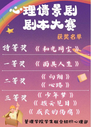 为增强学院心理育人时效,提高大学生综合素质和艺术修养,创造良好的心理健康教育氛围,2022年10月中旬,管理学院学生联合组织心理部举办2022年度心理情景剧剧本大赛。本次大赛面向管理学院全体学生,大赛由组委会综合评选,共选出特等奖一名,一等奖一名,二等奖两名,三等奖三名。