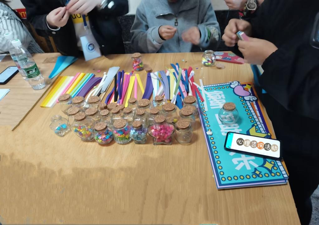 心理部干事与心理朋辈引导同学有序参与活动。同学们积极了解心理健康知识,填写专业的心理健康测量表并与老师进行交流。老师为同学的测量表中所体现的心理健康状况做详细分析,耐心地解答同学的心理困惑,为同学进行适当的心理调适。“心语星愿”活动更是吸引大家的目光,在同学们积极参与下,一张张笑脸与一颗颗纸星星组成了一副其乐融融的温馨画面。现场气氛热烈,活动得到了积极的反响。