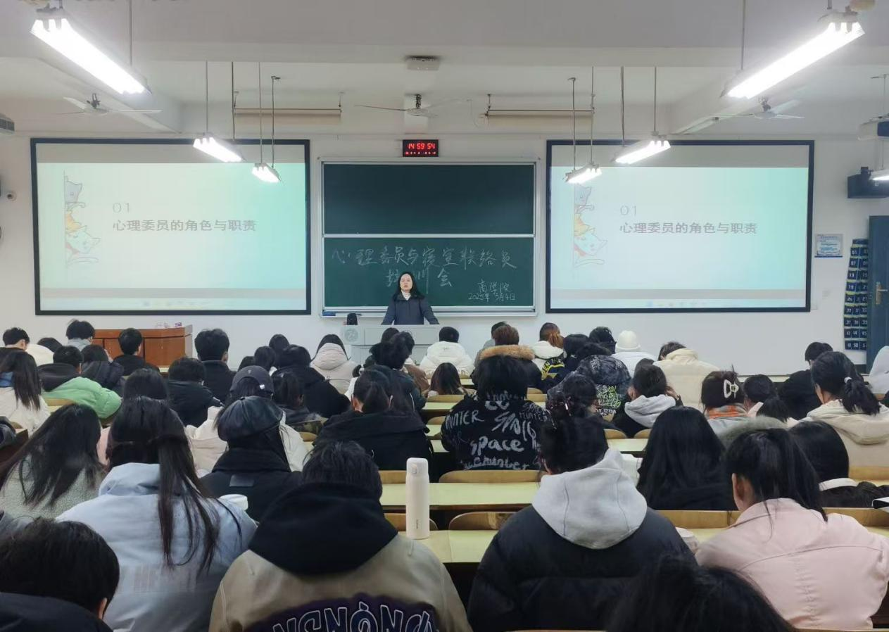 于3月4日下午三点在主校区D202召开心理委员暨寝室心理联络员培训会议。本次活动由刘佳馨老师主讲,旨在提升相关同学的专业素养和工作能力,夯实校园心理健康工作基础。