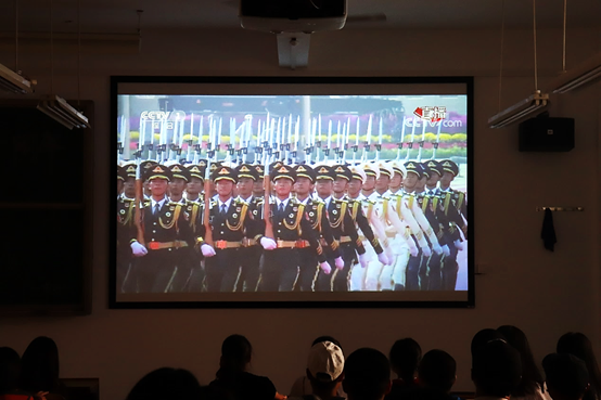 10月1日上午10时,习近平、李克强等党和国家领导人以及江泽民、胡锦涛同志来到了天安门城楼主席台,与全国人民共同庆祝祖国70华诞。当礼炮响起,三军仪仗队护卫国旗铿锵前进,整整168步,步步坚定有力,昂首挺胸,整齐划一,教室内观看阅兵的同学们不由激昂,响起振奋人心的掌声。