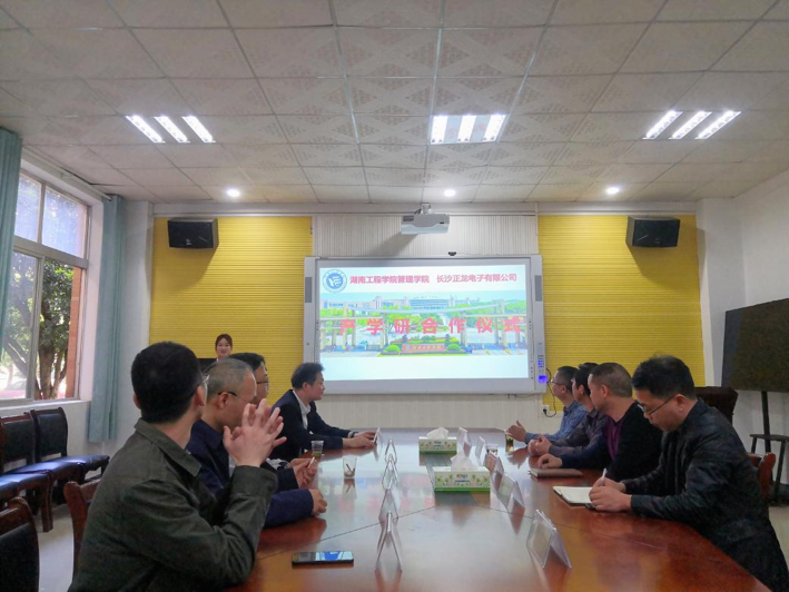 管理学院与长沙正龙电子有限公司产学研合作仪式于主校区教学楼F104举行。管理学院院长徐运保、副院长潘立军、黄毅、学办主任谭超、校友罗正龙、长沙正龙电子设备有限公司企业代表参加了此次仪式。