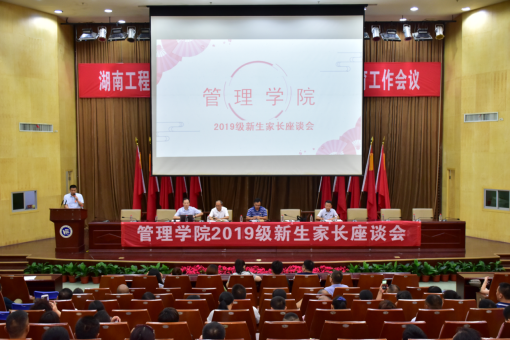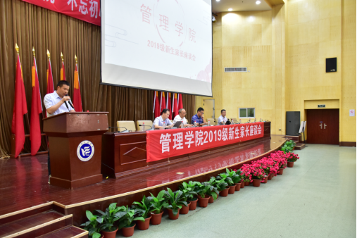 于新校区一报告厅召开2019级新生家长座谈会,与家长们共谈学生发展。管理学院院领导,新生班主任,学生辅导员以及2019级新生家长共同到场参会。