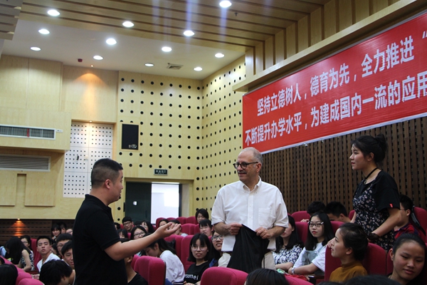 Paul Daly还和同学们进行了互动交流,回答了同学们关于学生管理、学生活动、学习方式、就业创业等方面的问题。我校学生良好的英语表达能力、提问的独特视角,得到了Paul Daly的夸赞。而每一个提问的学生都得到了Paul Daly赠送的小礼品,现场气氛十分热烈。