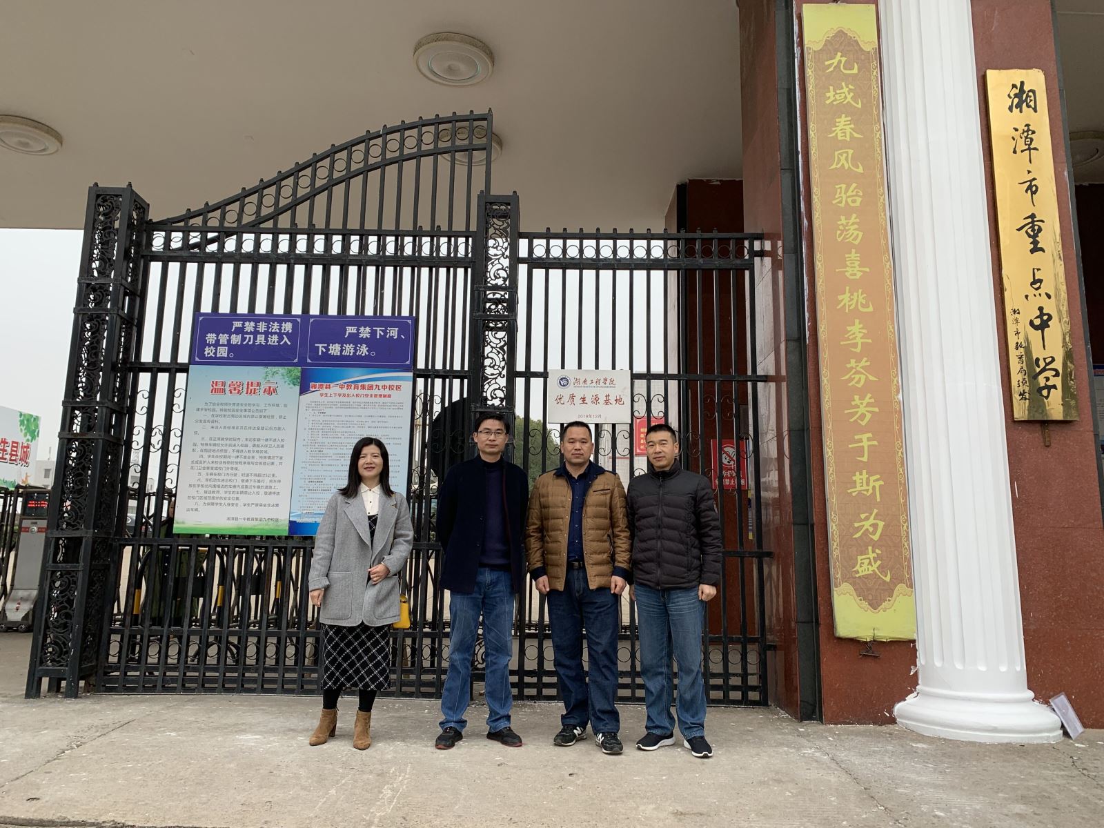 12月5日上午,管理学院受招生与就业指导处委托,前往我校友好联系高中湘潭县一中教育集团之一的湘潭县第九中学举行“优质生源基地”挂牌仪式。管理学院党总支副书记钱祖煜领队,学办主任罗荃老师和辅导员黎博老师随行。湘潭县第九中学总务处主任邓明辉和教务处主任易亚军代表校方接收授牌。