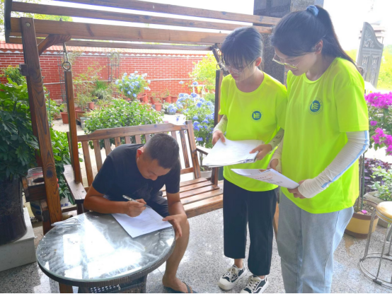陈灿带领暑期“三下乡”社会实践团成员入户发放问卷(右一为陈灿)