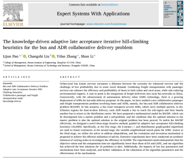 物流管理与优化团队在客货邮融合领域取得重要研究进展。团队基于自动配送机器人(ADR)技术的快速发展,提出了一种城乡公交班车协同ADR开展快递投递服务的模式,并针对该组织模式的关键调度问题——公交与ADR协作配送车辆调度问题进行了数学建模与特征研究,并成功提出一种知识驱动的自适应延迟接受迭代爬山启发式算法高效求解了该问题,为城乡客货邮融合开展提供了新模式与新方法。