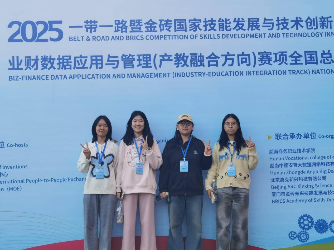 2023级会计学专业的郑明霞、吴玉荟、王芊芊、许彤四位同学组成。在王染、刘喜梅两位指导教师悉心指导下,团队深耕赛事核心模块,反复打磨业务场景还原、账务处理等关键技能,不断优化团队协作流程。比赛中,团队成员分工协作、默契配合,在两个150分钟的模块竞赛中精准完成各项任务,成绩名列前茅,展现了过硬的数字化应用与全业务流程把控能力。