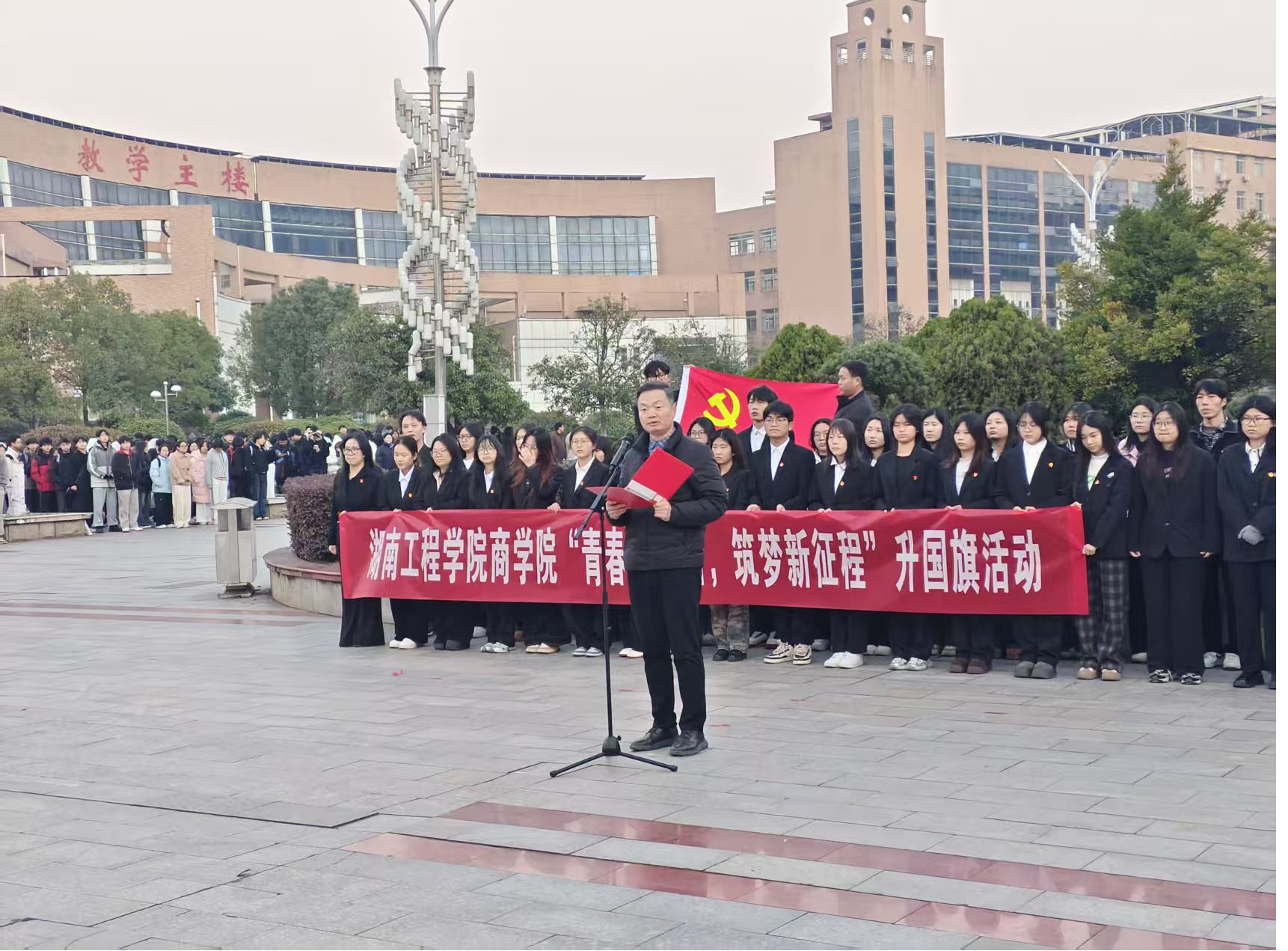 潘立军教授在国旗下讲话,勉励全体学子胸怀家国、勇担重任,将个人理想融入时代发展,用实干与奋斗书写无悔青春。