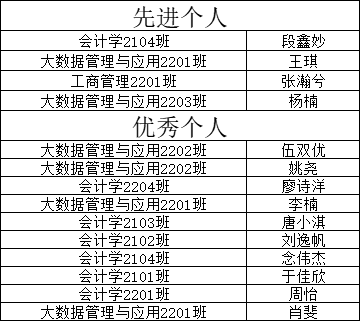 委员会管理学院团总支开展的2023年毕业生团员组织关系转接,暨学社衔接工作中,段鑫妙等10人表现优异,经个人申报、学院团总支评审,拟确定段鑫妙等4人为2023年学社衔接工作“先进个人”,伍双优等10人为2023年学社衔接工作“优秀个人”。现将获奖名单予以公示。