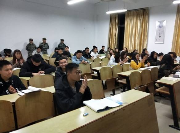 新校区校卫队的队员来到了工商管理专业进行了以"防火,防盗,防抢"为主题的下班宣传。