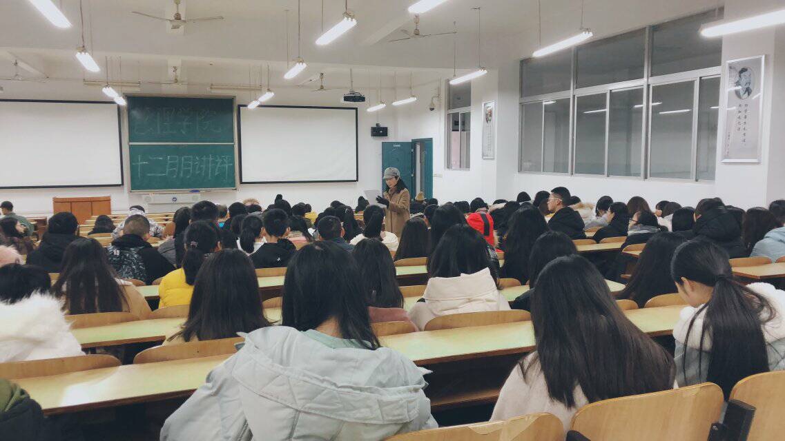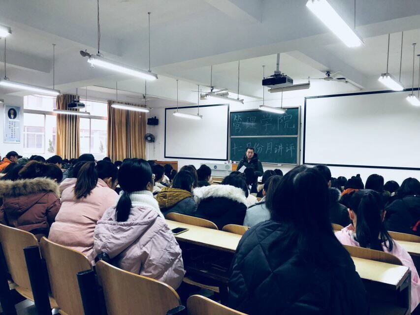 12月11日中午12:10,管理学院大一大二全体同学、大三大四全体班委及报考四六级的同学,在主校区教室内进行本学期第四次月评会议。学办辅导老师罗荃、黎博、单艳艳、包海燕、周艺、宋志航对工商管理、电子商务、旅游管理、人力资源管理、会计学、物流管理、市场营销七个专业进行了讲评。