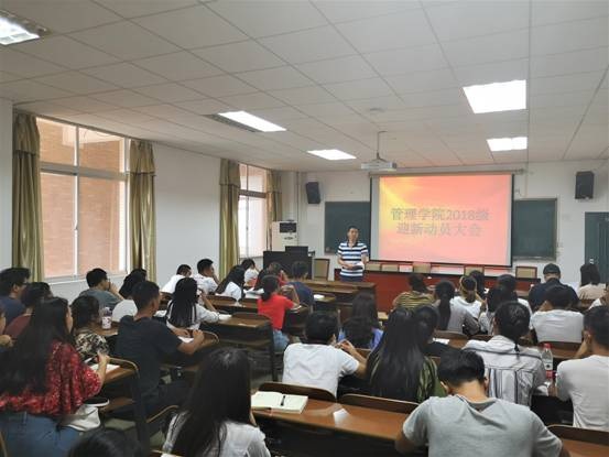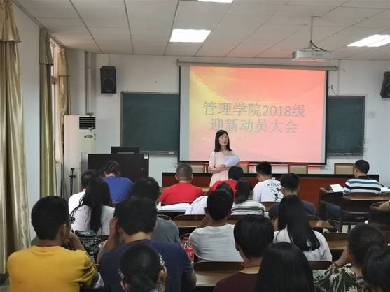 管理学院在G505成功召开"2018年迎新动员大会"。此次会议由学班主任罗荃老师主持,全体辅导员老师、2018级新生班主任,下班党员、朋辈心理辅导员、学生会全体成员参加会议。