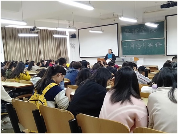 2018年10月25日中午,管理学院大一大二全体同学、大三大四全体班委,在主校区教室内进行本学期第二次月评会议。学办辅导老师罗荃、黎博、单艳艳、包海燕、周艺、宋志航分别对工商管理、电子商务、旅游管理、人力资源管理、会计学、物流管理、市场营销七个专业进行了讲评。
