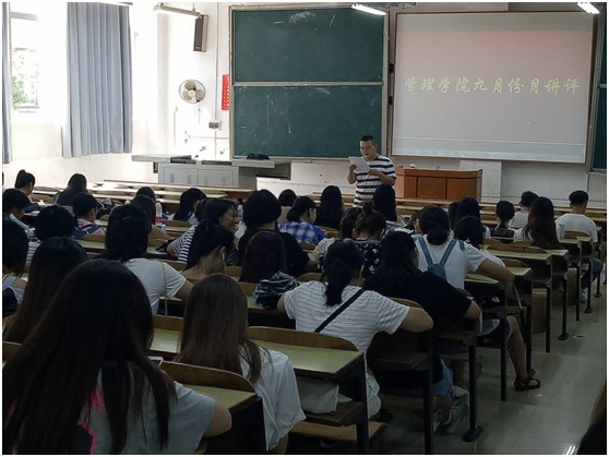 9月25中午12:20,管理学院工管、会计、旅管、物流、人力、市营全体单学号同学,在主校区教室内进行本学期第一次月评会议。学办辅导老师罗荃、黎博、单艳艳、包海燕、周艺、宋志航对工商管理、旅游管理、人力资源管理、会计学、物流管理六个进行讲评,本月心理会议也同月评会同一时间顺利展开。