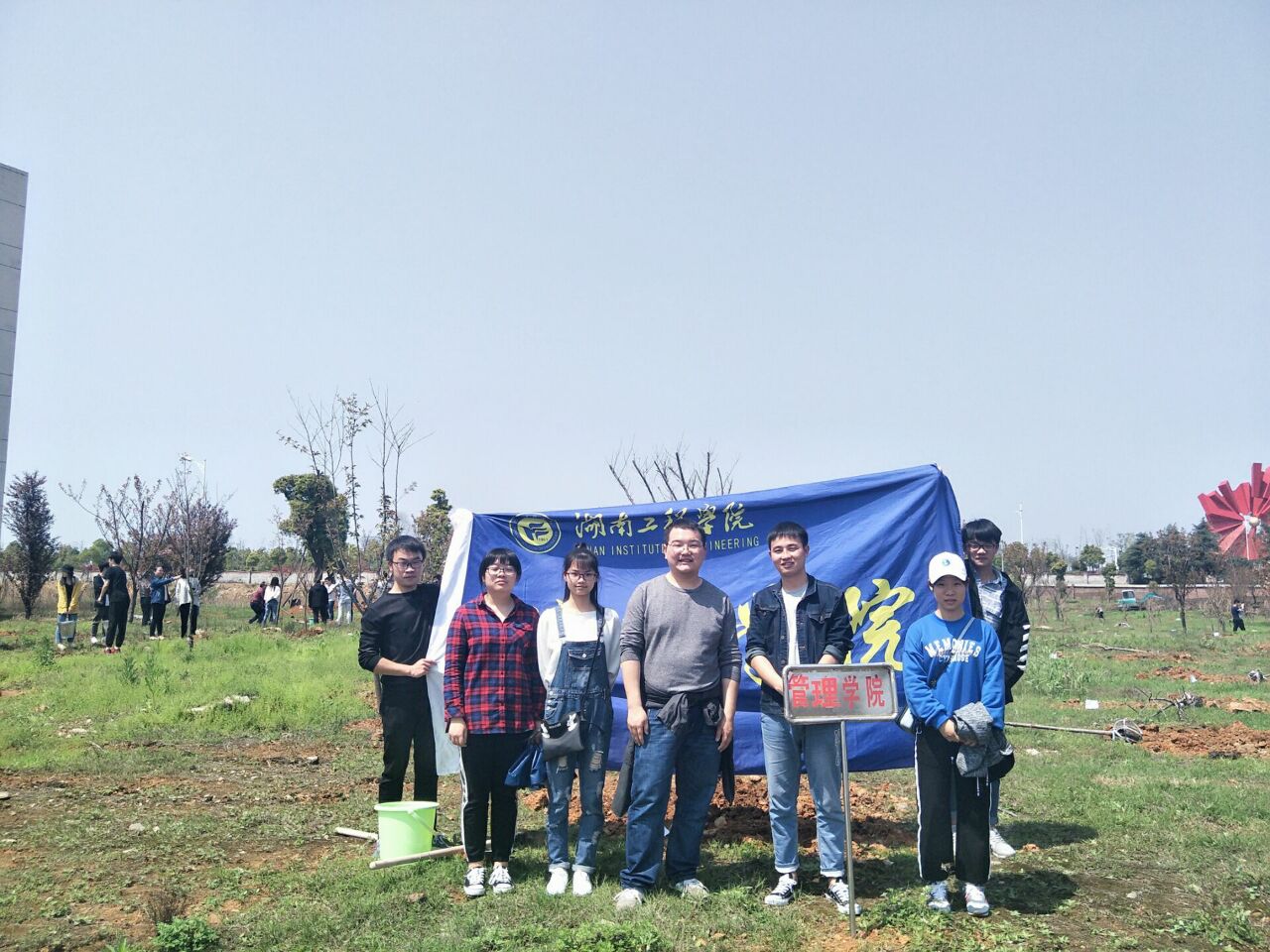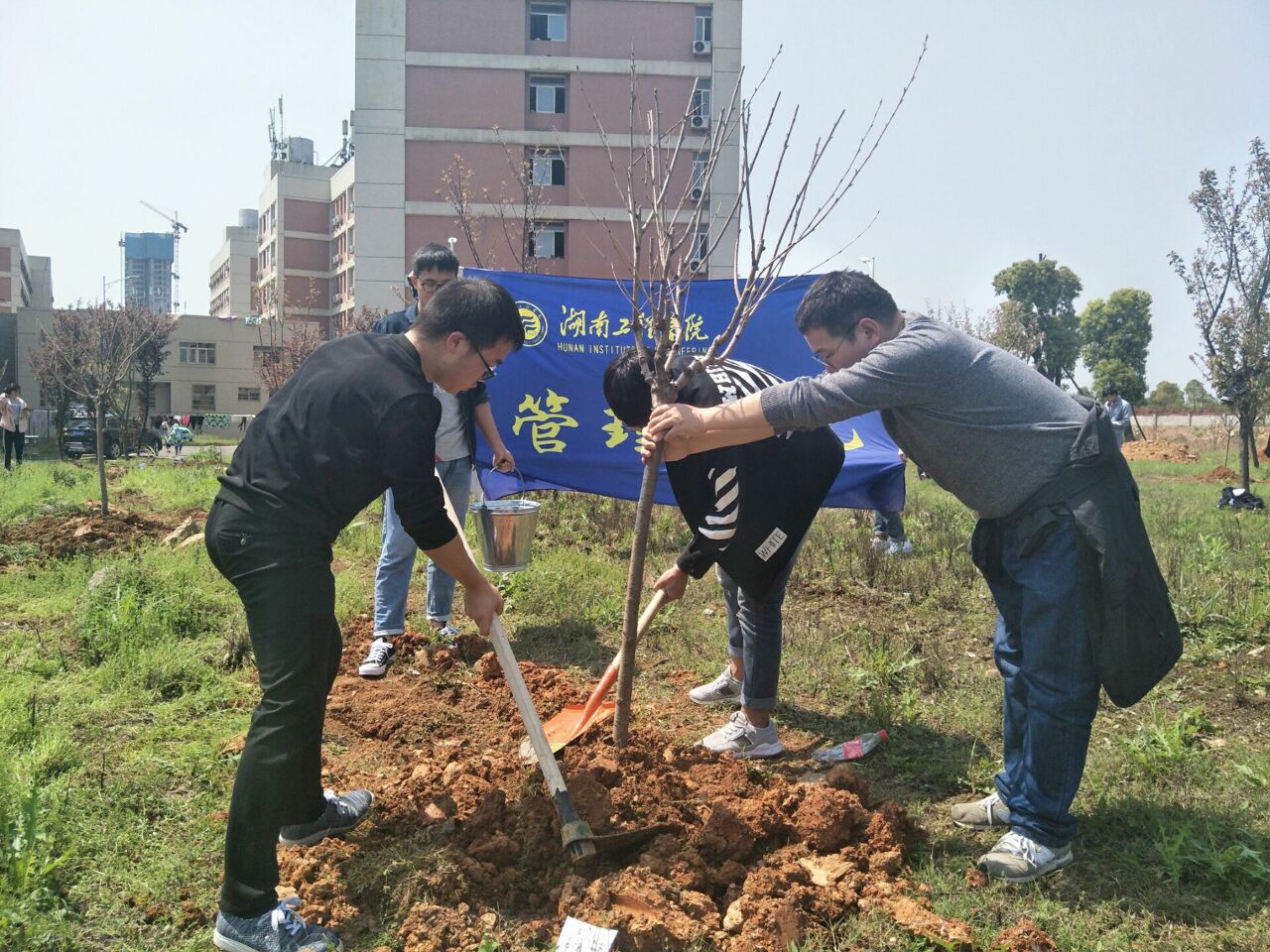 3月27日下午一点,为了绿化、美化校园环境,建设两型校园,管理学院五名志愿者在学生办公室黎博老师和管理学院学生联合会主席杨霖的带领下于滨江公寓参加了大型植树活动。