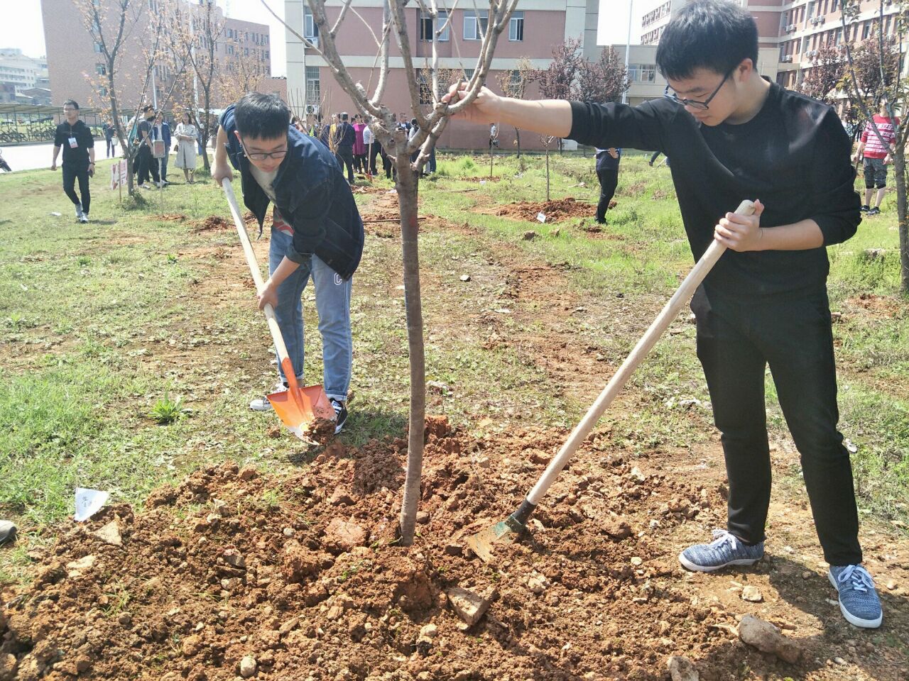 活动期间, 老师和同学们表现出极大的热情。大家领取植树工具后,开始了此次植树活动。经过明确的分工,活动进行得有条有理。在黎博老师的亲身带领下,志愿者们挖坑、铲土、填树坑,还有的提桶浇水,道道工序都做的井然有序。老师与志愿者们团结一致,齐心协力,很快就完成了五棵树的种植。志愿者们虽一个个汗流浃背, 但看到一棵棵新栽下的树木英姿雄发,迎风挺立时,一个个无不露出欢欣的笑容。