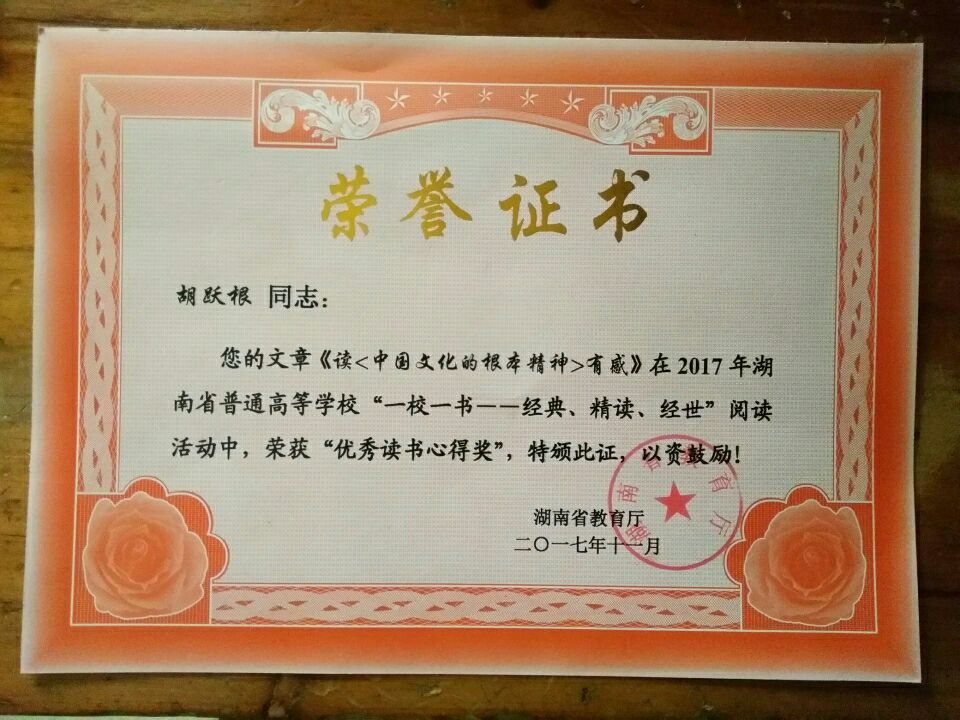 旅管1701班胡跃根同学的《读〈中国文化的根本精神〉有感》、在全省各高校众多选手中脱颖而出,斩获“读书心得奖”。