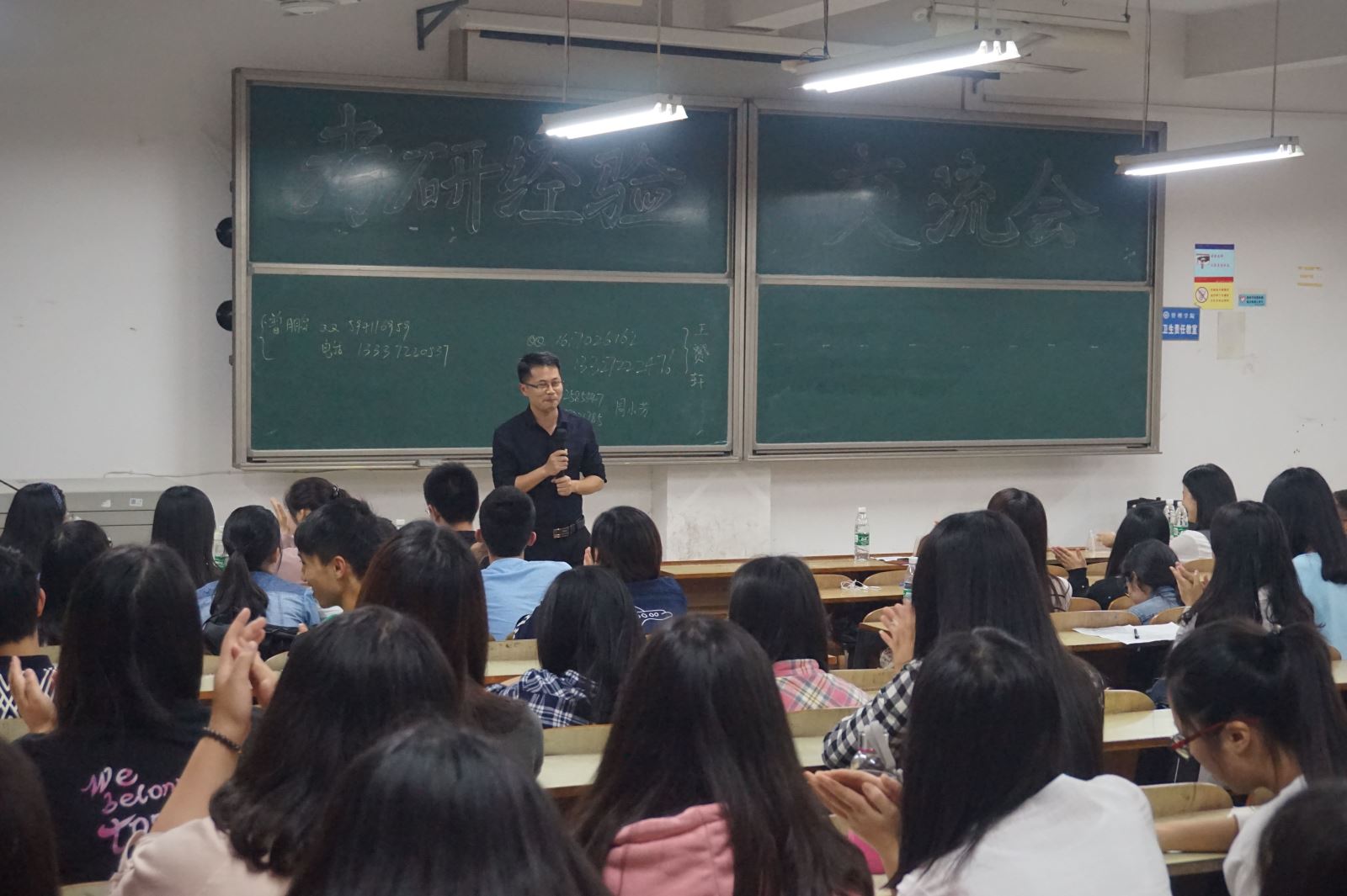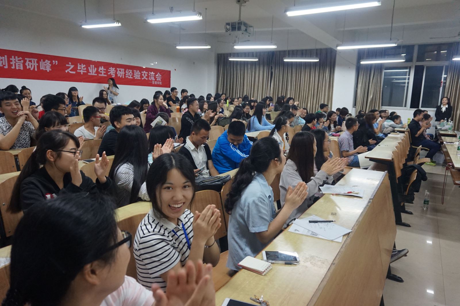 5月25日晚,管理学院 “群英聚首,剑指研峰”考研经验交流会在主校区教学楼D203成功举行。管理学院副院长余博和学办主任罗荃出席交流会,考取研究生的五位毕业生代表作为嘉宾,分享了他们的考研心路历程,为学弟学妹们传经送宝,全院有志考研的150余名学生到场聆听。