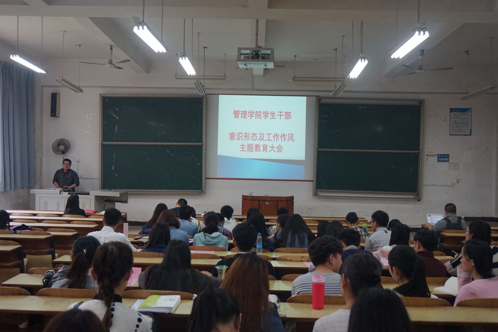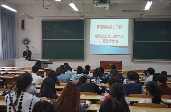 4月14日中午12点, 管理学院在主校区教学楼D101举办 “学生干部‘意识形态’及‘工作作风’主题教育”大会。学院党总支副书记钱祖煜、全体学办老师出席了此次会议,学院全体学生会干部及各班班长、团支书参加了此次大会,认真参加学习。