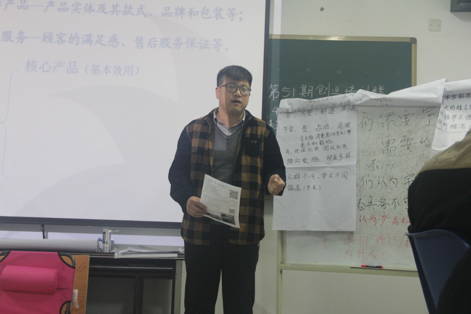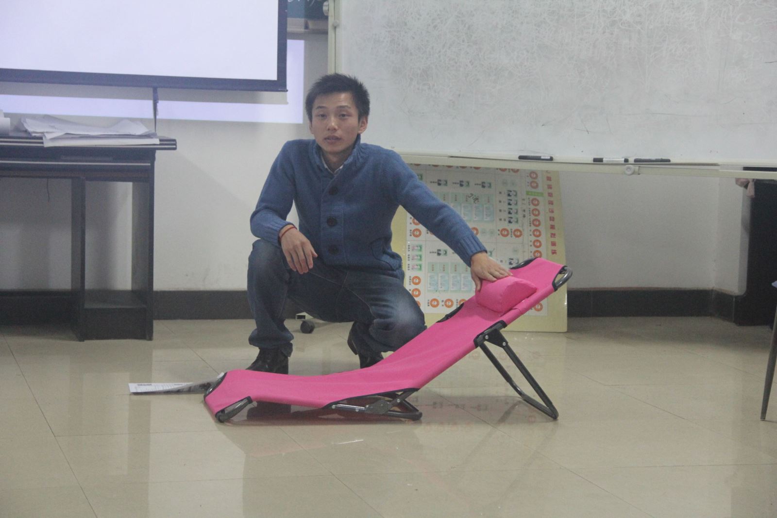 学子创业的激情和信心。本次邀请到我校SIYB 创业培训第36期学员陈联祥分享创业经历。今年陈联祥和他的创业团队创立了宇宙大学公司,推出了第一款具有国家实用新型专利的产品“宇宙大学椅”,陈联祥现场介绍演示了该产品的性能和用法。在老师们的讲授和指导下,大家根据课堂主题结合“宇宙大学椅”产品的营销积极讨论、相互交流、引爆创意火花。理论联系实践很好地达成了本次课堂教学的目标,激励了湖工学子的创业,也为正在拼搏的创业学子提供了有益的帮助。