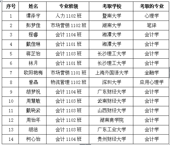 共有14名学生成功考取了研究生,其中不乏考入暨南大学、湘潭大学、上海外国语大学、广东财经大学、湖南大学等著名高校的优秀学子。