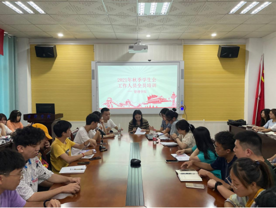 为进一步深化学生会改革,提高学生会工作人员的综合素质,加强学生组织的凝聚力和战斗力,9月17日中午12: 00,管理学院在F104会议室召开新任职工作人员全员培训大会。学院团总支书记陈祎婷、团总支及学生会全体工作人员参加本次培训。会议由学生会主席李斯琴主持。