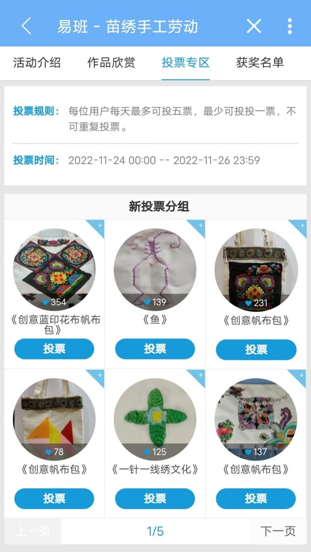 同学的积极参加和热情投票下,最后根据得票情况评选出特等奖两名,一等奖一名——TTLYZ队《创意蓝印花布帆布包》,二等奖两名——苗绣小天才队《冰墩墩》、今天也要加油队《苗绣小背心》,三等奖三名——爱会消失对不队《创意帆布包》、今天也要加油队《喵喵喵蝴蝶绣》、锦绣山河队《望舒曦和》。
