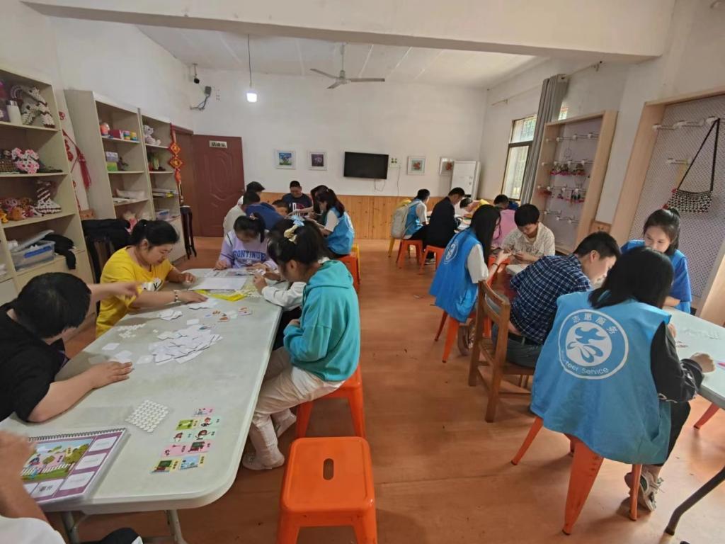 活动伊始,园长向志愿者们介绍了今天的活动流程,并对志愿者们进行了分组,团队合作帮助亲园的伙伴们完成相应的学习任务。此次志愿活动的主要内容是辅导亲园伙伴们粘贴绘本和画画。在小小的教室一方,充满着欢声笑语,志愿者在辅导亲园伙伴们粘贴绘本的同时,还和小伙伴们一起聊天、分享生活和自己的兴趣爱好,让学习变得生动有趣。还有一部分亲园小伙伴们和志愿者一起画画,他们将画纸放于桌面之上,神情专注的在一张张A4纸上画上了自己最喜欢的食物和水果。阳光透过树叶的缝隙,在地上拉出一条条长长的影子,那是亲园伙伴们和志愿者互相陪伴的影子。